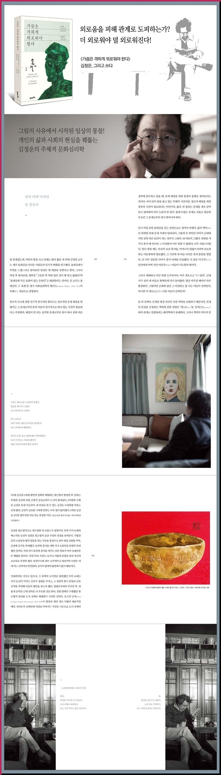 인생에 한 번쯤 외로움이 필요한 순간 ‘고립’을 통해 ‘몰입’의 기쁨을 만나다! 4년간의 격한 외로움의 시간이 빚어낸 예술적 사유, 인문학적 성찰, 사회분석적 비평이 한 권의 책으로 이 책 가끔은 격하게 외로워야 한다: 내 삶의 주인이 되는 문화심리학 (21세기북스)는 그림과 사진, 심리학적·사회문화적 통찰이 총망라되어 있는 크로스오버 도서로, 전방위적 행보를 보여온 문화심리학자 김정운의 예술가적 면모를 본격적으로 선보인 첫 책. 지난 4년간 축적해온 내면의 사유와 성찰이 지성과 감성, 예술성을 아우르는 한 권의 책으로 완성되었다. 표지 그림 ‘외로움과 그리움 사이’ 역시 김정운의 작품이다. 나이 오십 넘은 남자가 홀로 밥해 먹고 빨래하며, 남는 시간은 오롯이 그림을 그리고 글을 썼다. 서툴지만 개성 있는 그림은 우리 삶에 대한 통찰을 이끌어내며, 심리학적 분석이 담긴 글을 통해 ‘자아’와 ‘세계’에 대한 주체적 성찰로 완성되었다. 거기에 일상의 찰나를 포착한 사진과 촌철살인의 유머가 더해져, 유쾌하고 편안한 ‘인간 김정운’의 면모까지 친근하게 담아냈다. 각 글의 말미에는 문화심리학자 김정운의 시각으로 새롭게 해석한 키워드들이 수록되어 독자들의 이해를 돕는다.